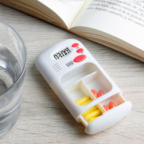 Pastillero con alarma con múltiples repeticiones (duración de 30 segundos), programación de horas y 2 compartimientos para pastillas.