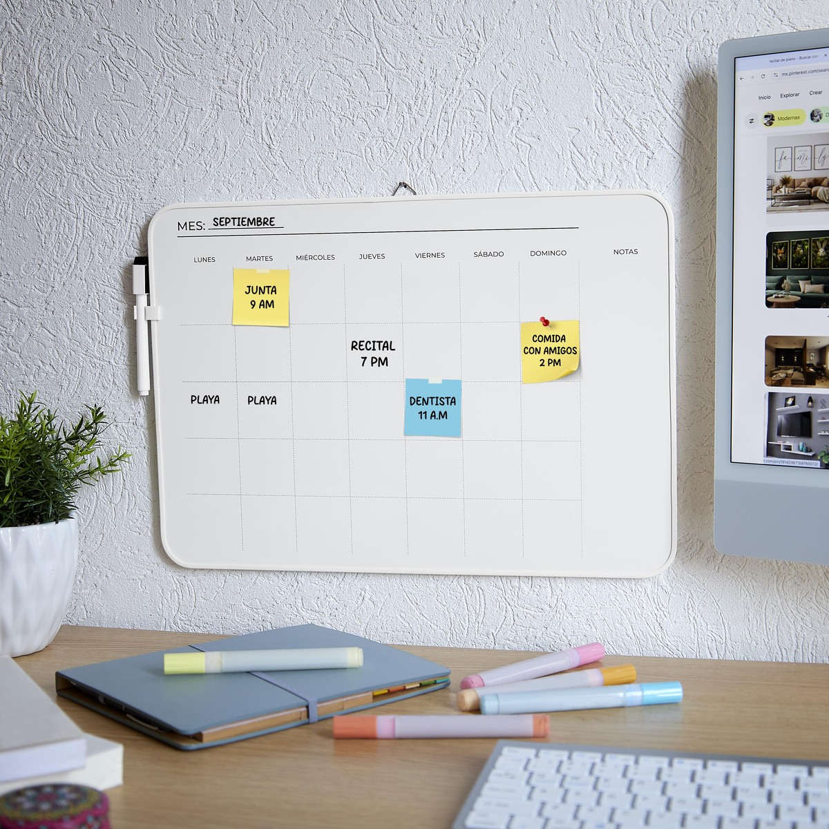 Pintarrón con planeador mensual ideal para organizar tus prioridades. Incluye marcador con borrador y gancho superior para colgarlo fácilmente en tu espacio de trabajo. Su retícula te permite personalizar mes y días, perfecto para uso diario en el hogar, oficina o colegio.