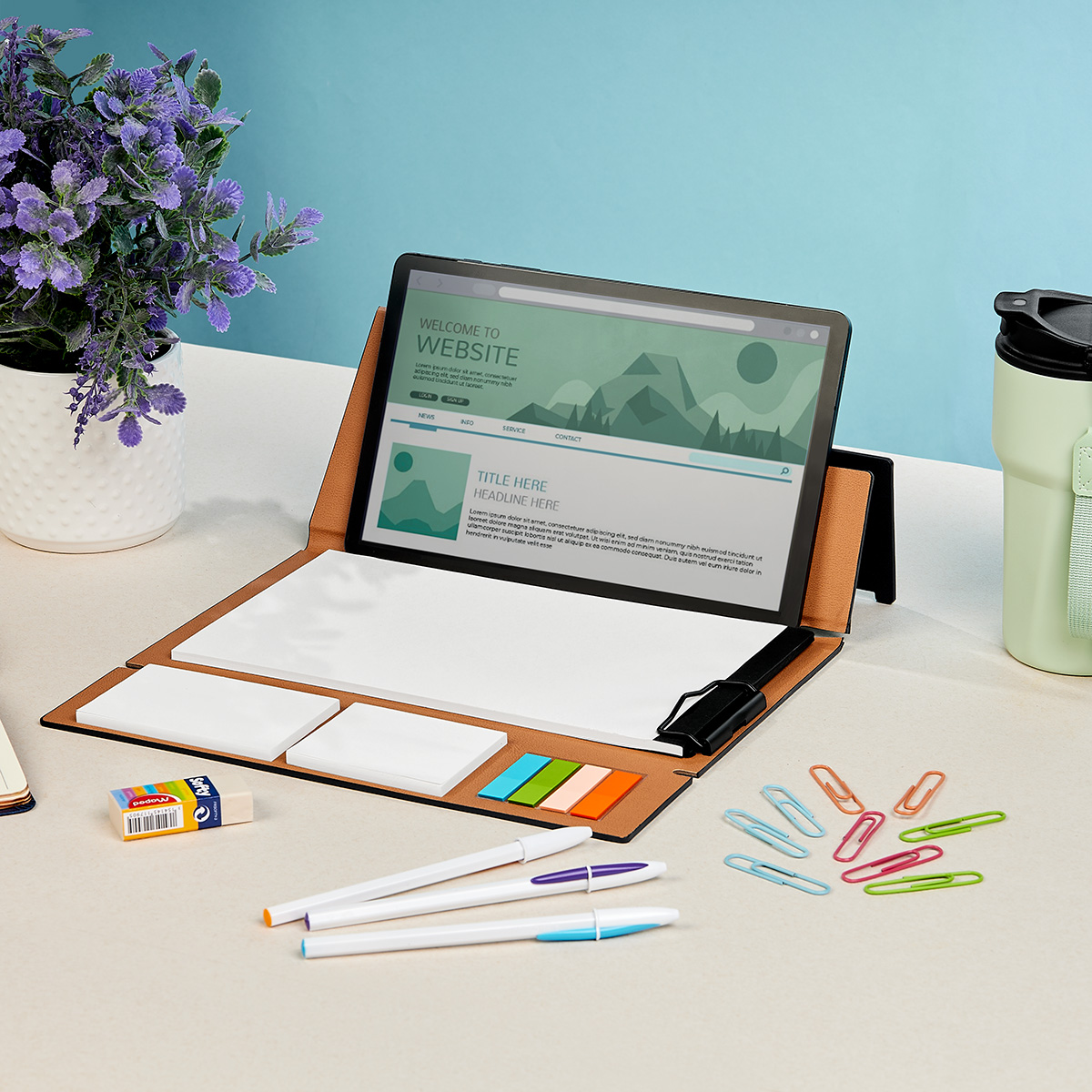 Carpeta planeador con cubierta rígida. Sus hojas blancas ofrecen un lienzo para dibujar, esbozar y escribir. Su diseño plegable la convierte en un práctico soporte para tablet o smartphone. En su interior, cuenta con un block de 40 hojas, dos blocks de 50 notas adhesivas y 4 colores diferentes de banderines, cada uno con 25 piezas. Su clip metálico mantiene el block en su lugar y te permitirá reusarla, una vez que se agoten sus hojas.