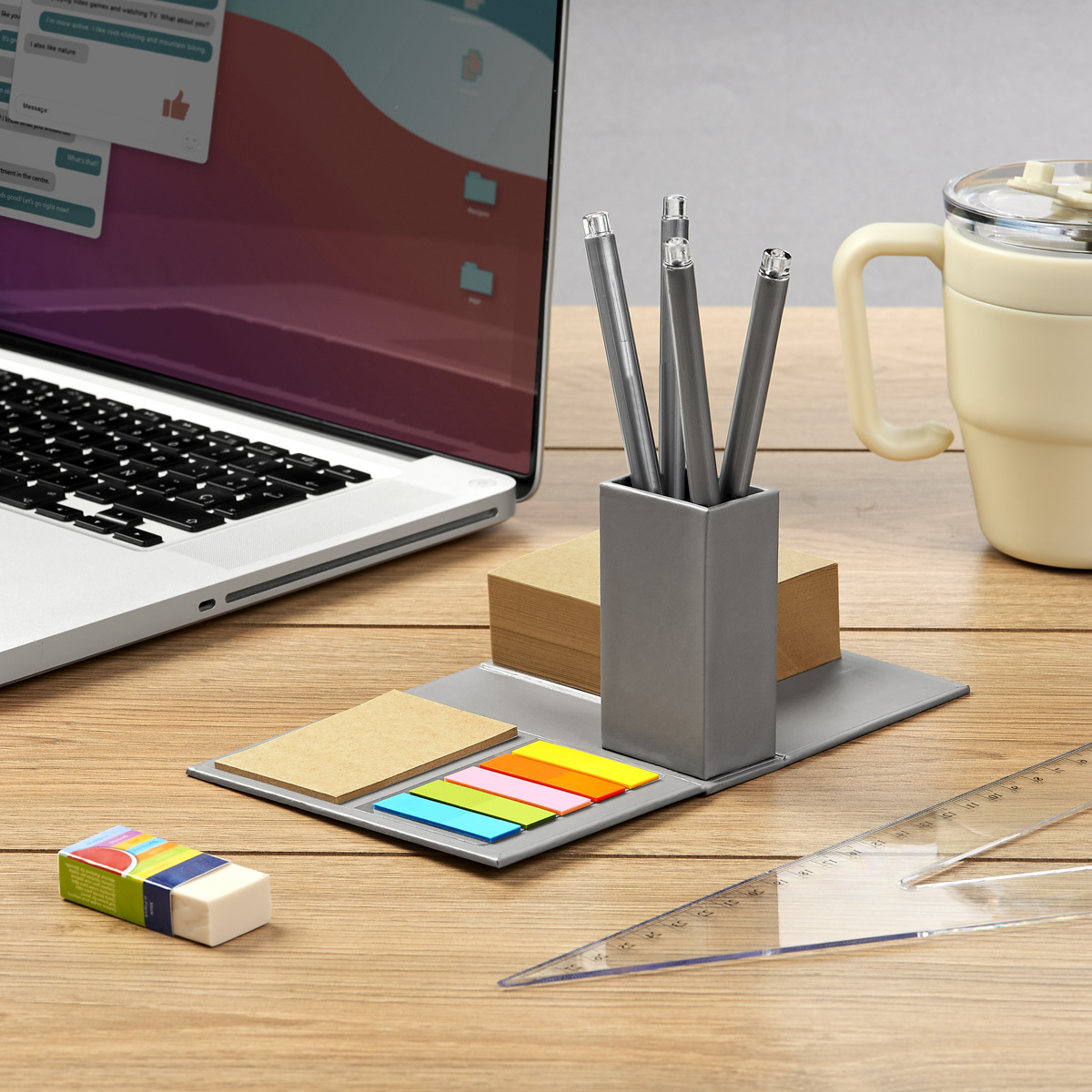 Porta notas plegable con cubierta rígida de cartón. Al desplegarlo revela un práctico porta lápices. Incluye block de 270 notas y 25 notas adhesivas de papel Kraft, 5 colores diferentes de banderines adhesivos, cada uno con 15 notas. Ideal para mantener tus notas y recordatorios organizados en un solo lugar, perfecto para oficinas y estudiantes.
