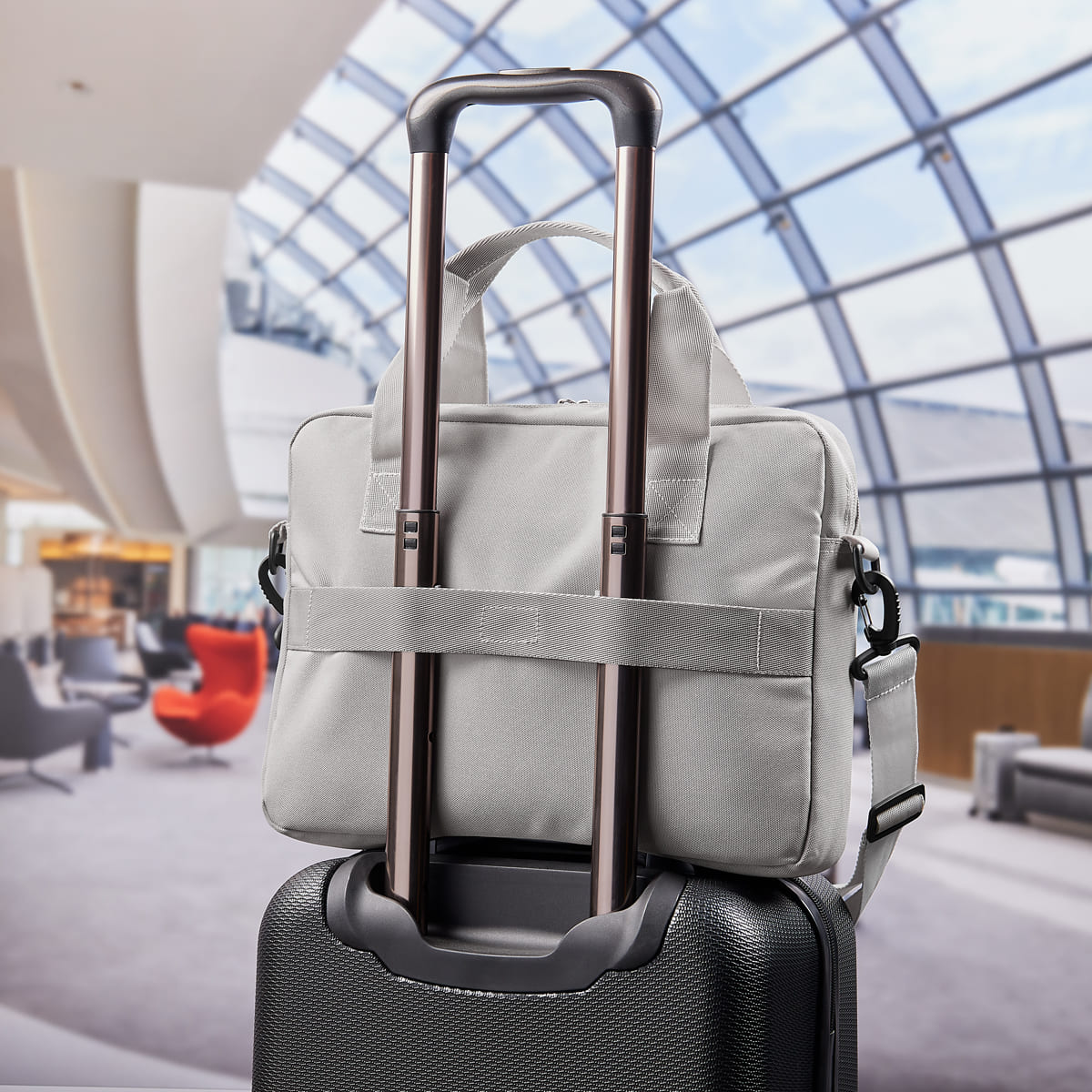 Portafolio para laptop de 15″. Al interior cuenta con organizador que permite mantener documentos, bolígrafos y otros objetos pequeños. Bolsa principal y bolsillo frontal con cierre. Incluye aditamento trasero para colocar en trolley, correa ajustable removible para hombro y asas superiores. Ideal para el trabajo o viajes de negocios.