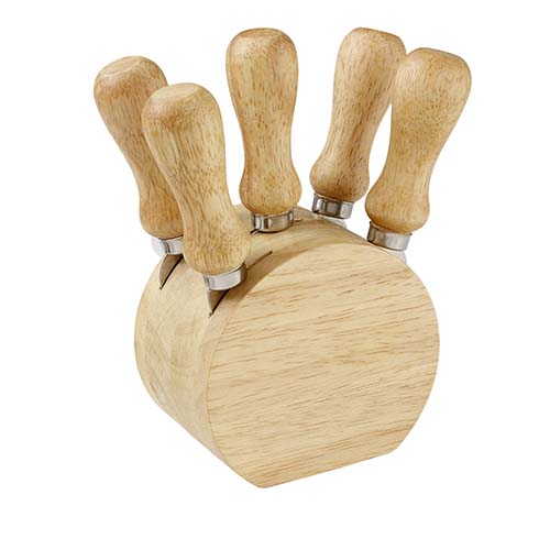 Set de madera, con 1 base con 4 cuchillos y 1 tenedor para quesos. La madera es un producto natural el cual puede presentar variaciones en tonalidades y vetas.
