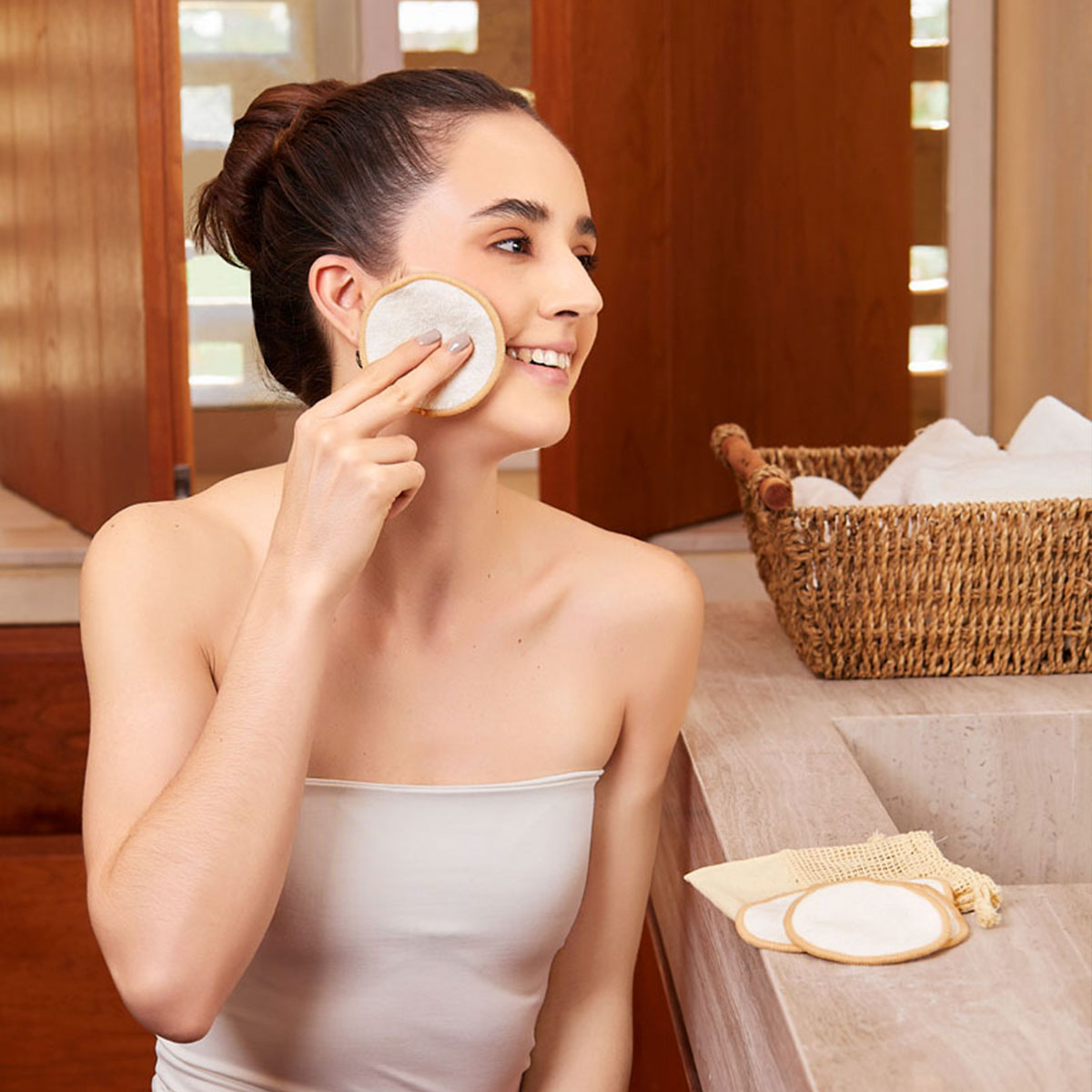 Set de 5 almohadillas desmaquillantes y reutilizables. Gracias a su material de fibra de bambú, son suaves para utilizar en tu piel. Incluye bolsa de algodón con cierre de jareta.
