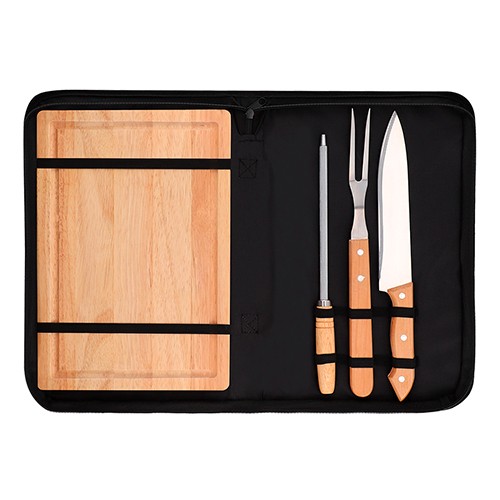 Maletín con cierre y asa. Incluye tabla, tenedor, cuchillo y afilador de cuchillo de varilla. La madera es un producto natural el cual puede presentar variaciones en tonalidades y vetas.