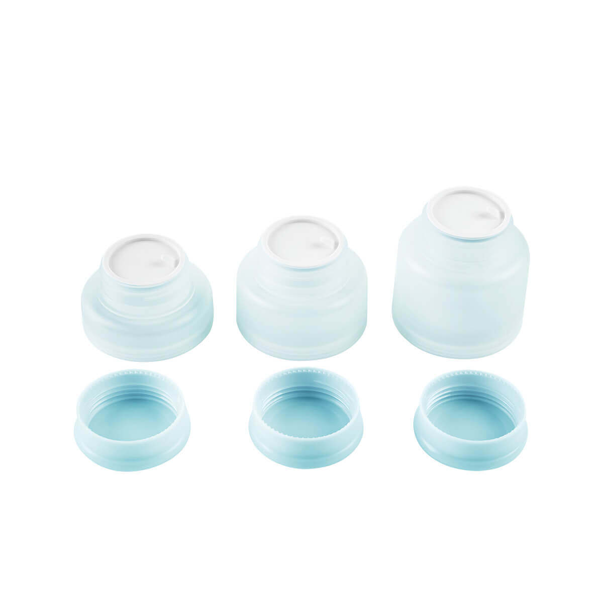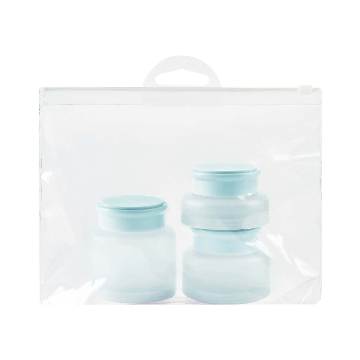 Set de contenedores de plástico para viaje. Ideales para almacenar productos de cuidado básico. Incluye bolsa con cierre zip.