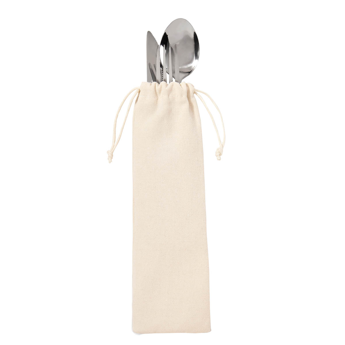 Set de cubiertos de acero inoxidable y mango de madera. Incluye cuchara, tenedor, cuchillo y práctica bolsita de canvas para llevarlos contigo a donde vayas, ya sea al trabajo, un picnic o de viaje.