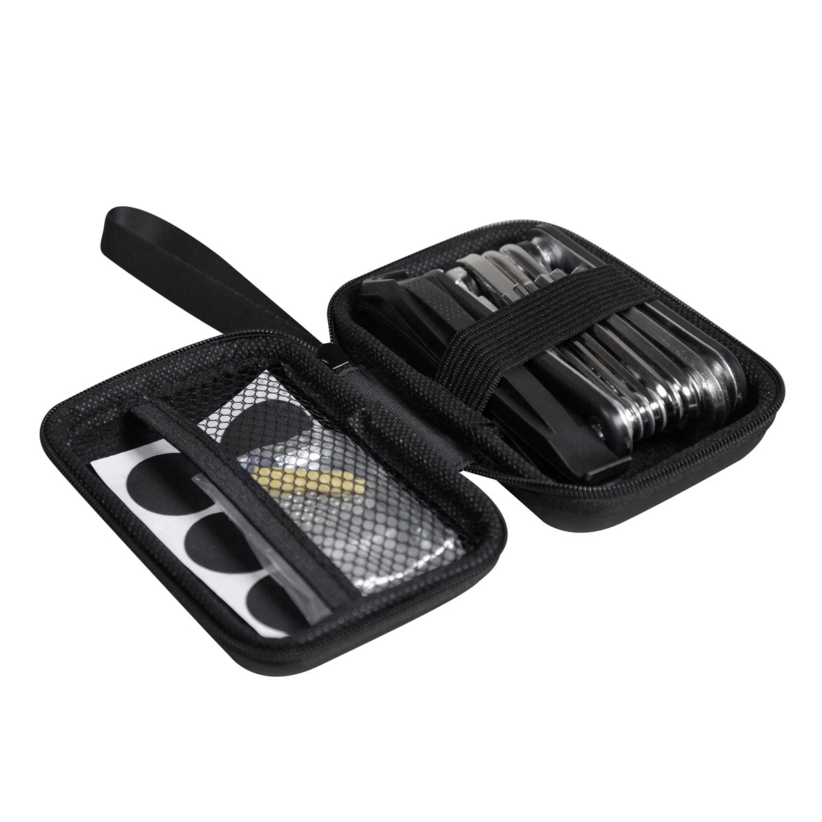 Kit de herramientas para bicicleta. Incluye 6 parches redondos y 2 palancas de plástico para neumático, 2 tubos de goma para fijar válvulas, 1 herramienta de lijado, 1 herramienta multifunción 16 en 1 con llaves allen y destornilladores. Estuche compacto de EVA con elástico que lo hace fácil de transportar y se ajusta de manera conveniente a la bicicleta o al equipo de ciclismo.