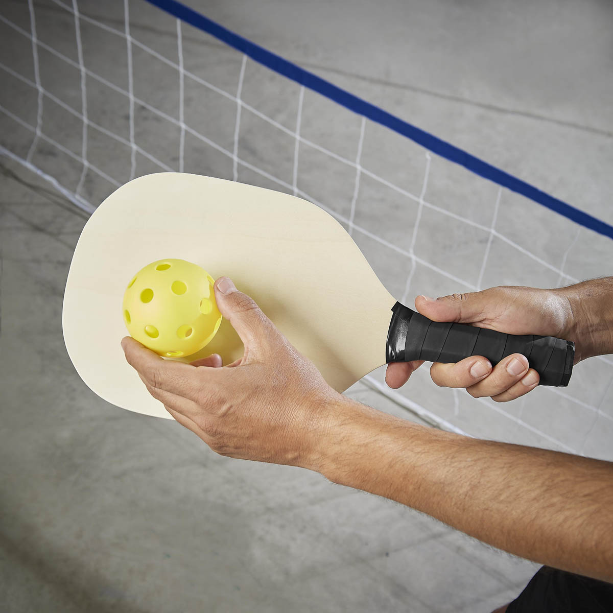 Set de raquetas para pickleball. Incluye dos raquetas de madera con mango ergonómico, dos pelotas de plástico y bolsa con malla para transportar. Este set es ideal tanto para los que buscan disfrutar del deporte en cualquier lugar.