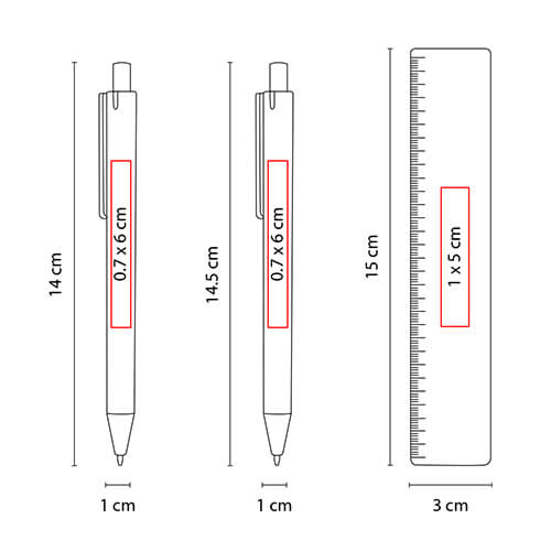 Medidas: 1 x 14 cm Bolígrafo / 1 x 14.5 cm Lapicera / 3 x 15 cm Regla / 3 x 2 cm Borrador