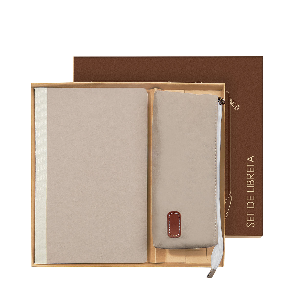 Set ecológico. Incluye libreta con 80 hojas a rayas y cubierta rígida de cartón kraft. Incluye un estuche porta-lapices de apertura con cierre y parche de curpiel, que le da un toque más elegante. La combinación de materiales, lo hace un producto perfecto para quienes buscan un equilibrio entre funcionalidad y sustentabilidad. Incluye caja individual.