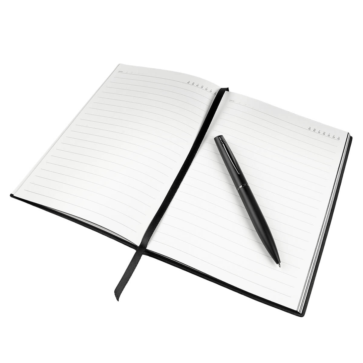 Set de regalo corporativo de 4 piezas. Incluye libreta de pasta blanda con 96 hojas a raya y listón separador, bolígrafo metálico con sistema twist, llavero de doble aro metálico con cinta de curpiel y termo de acero inoxidable de doble pared cerrado al vacío, terminado rubber que lo hace suave al tacto. Incluye caja rígida de regalo.
