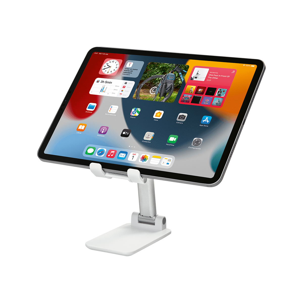 Soporte plegable. Soporte y base con material antiderrapante. Altura e inclinación ajustable. Desplegable a una altura máxima de 16 cm.
