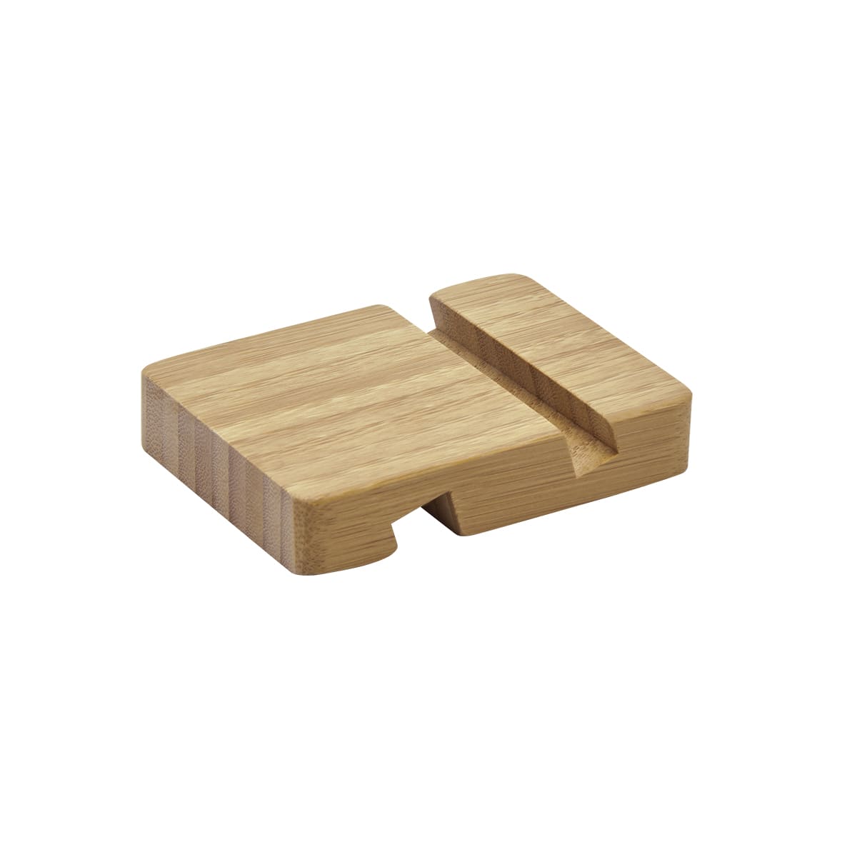 Soporte de bambú para smartphone o tablet. Incluye dos ranuras con diferente grosor para adaptarse a diversos dispositivos. El bambú es un producto natural el cual puede presentar variaciones en tonalidades y vetas.