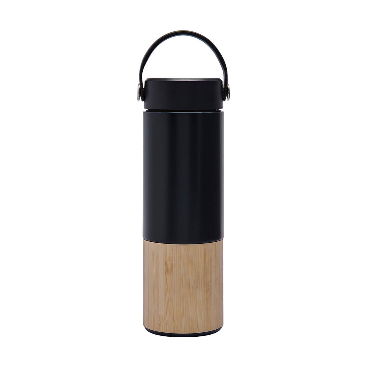 Doble pared con base de bambú. Cerrado al vacío. Pared interna y externa de acero inoxidable. Tapa de plástico con asa de silicón y cierre de rosca. Mantiene temperatura caliente 6 hrs y temperatura fría 8 hrs aproximadamente. Incluye caja individual. El bambú es un producto natural el cual puede presentar variaciones en tonalidades y vetas.