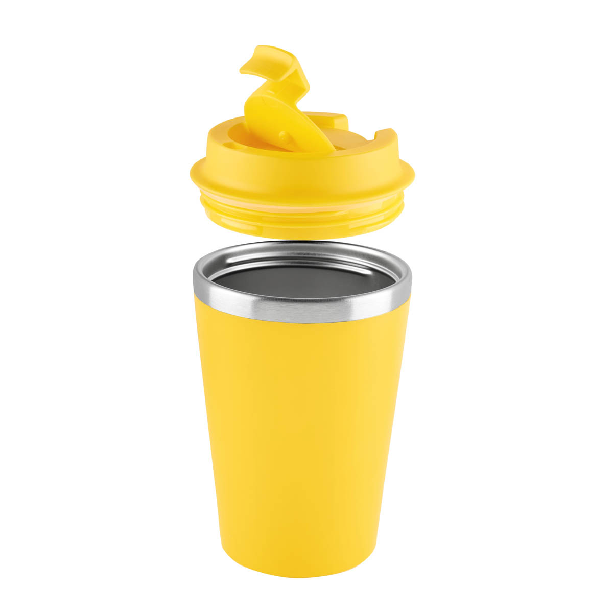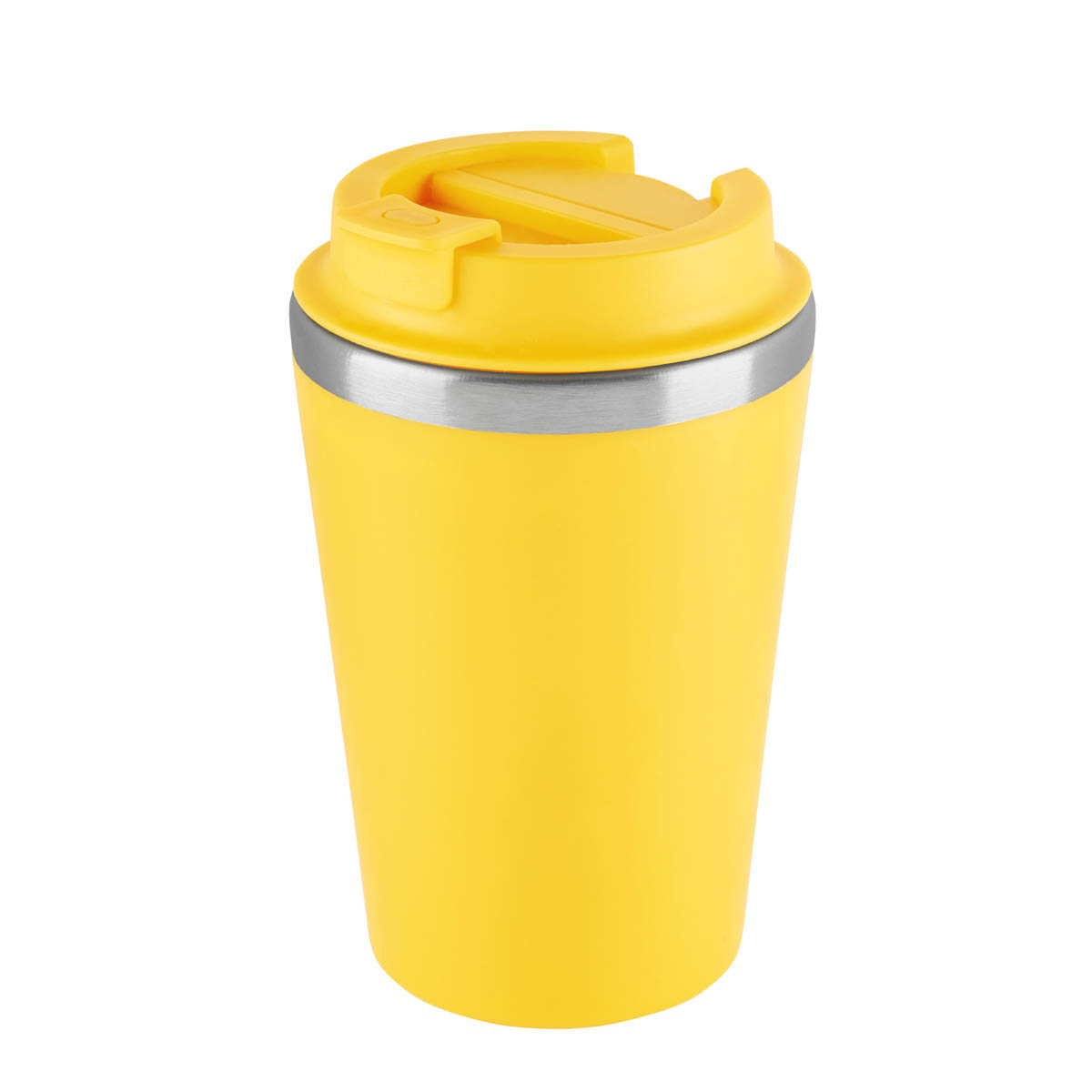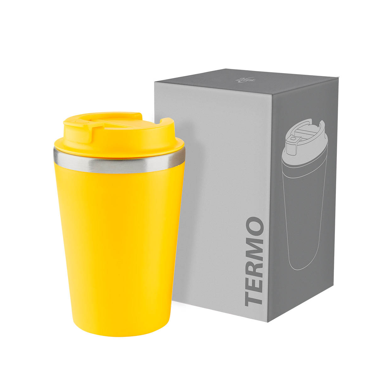 Termo doble pared. Pared interna de acero inoxidable y externa de plástico. Tapa con sistema de rosca que garantiza un cierre hermético. Sobretapa con sistema push que previene derrames. Su elegante detalle metálico, rompe con la monocromía y añade un toque de distinción. Capacidad de 12 Oz. Base de 7 cm de diámetro. Incluye caja individual.