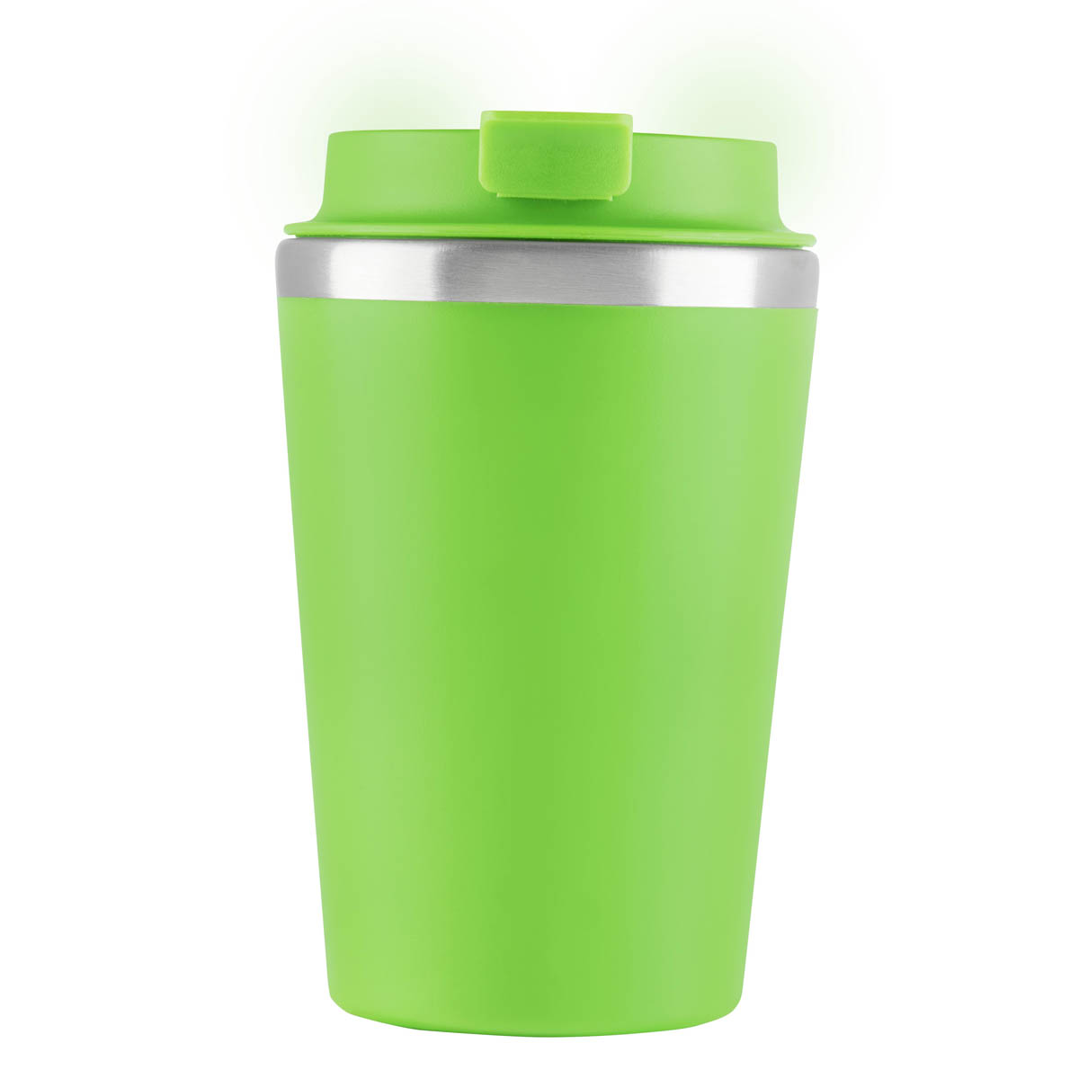 Termo doble pared. Pared interna de acero inoxidable y externa de plástico. Tapa con sistema de rosca que garantiza un cierre hermético. Sobretapa con sistema push que previene derrames. Su elegante detalle metálico, rompe con la monocromía y añade un toque de distinción. Capacidad de 12 Oz. Base de 7 cm de diámetro. Incluye caja individual.