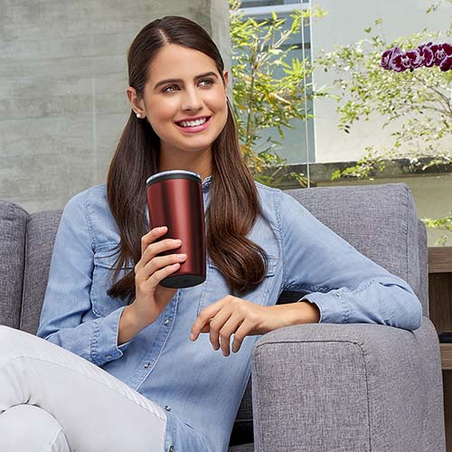 Doble pared. Pared interna plástico, pared externa acero inoxidable. Tapa de plástico con válvula de seguridad. Incluye caja individual.