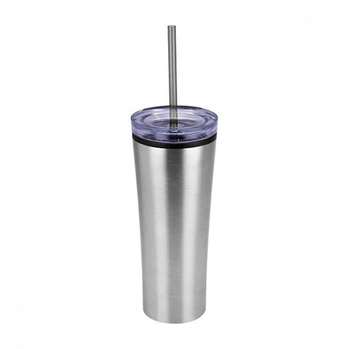 Doble pared. Pared interna plástico, pared externa acero inoxidable. Tapa y popote de plástico. Incluye caja individual.