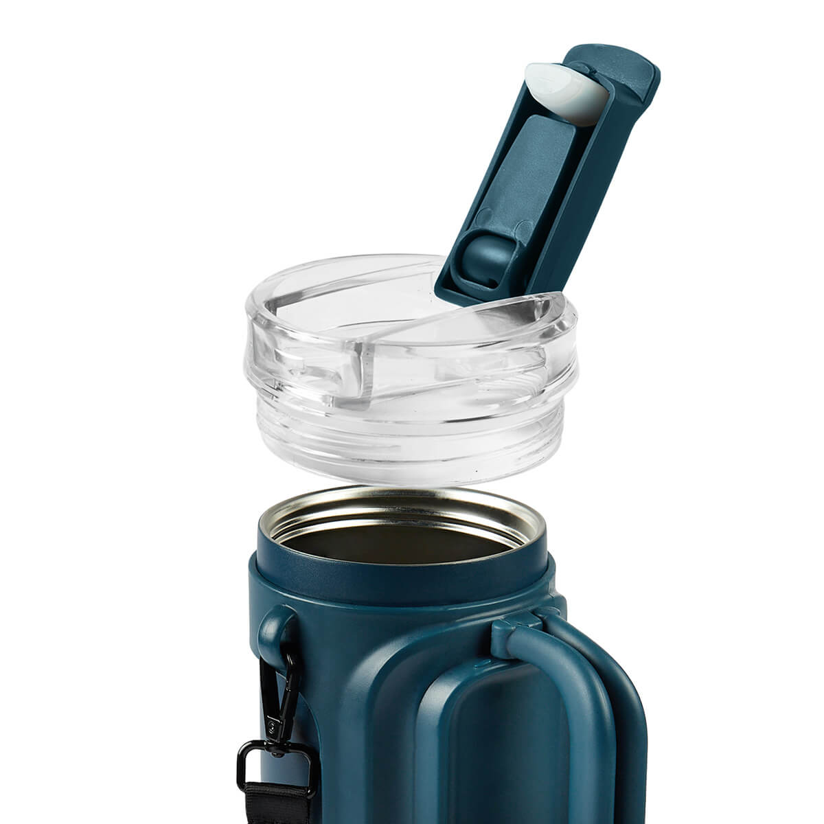 Termo doble pared. Cerrado al vacío. Pared interna y externa de acero inoxidable. Terminado rugoso que facilita su agarre. Incluye tapa de plástico con sistema de rosca y la sobretapa mulitfuncional, permite beber por medio de su boquilla clásica o a través de su boquilla plegable con popote. Su diseño innovador incorpora un asa plegable para un uso más práctico y un asa para hombro ajustable y removible, con broches metálicos. Mantiene las bebidas calientes hasta por 6 hrs y frías hasta por 8 hrs. Capacidad de 30 Oz. Base de 7.4 cm de diámetro. Incluye caja individual.