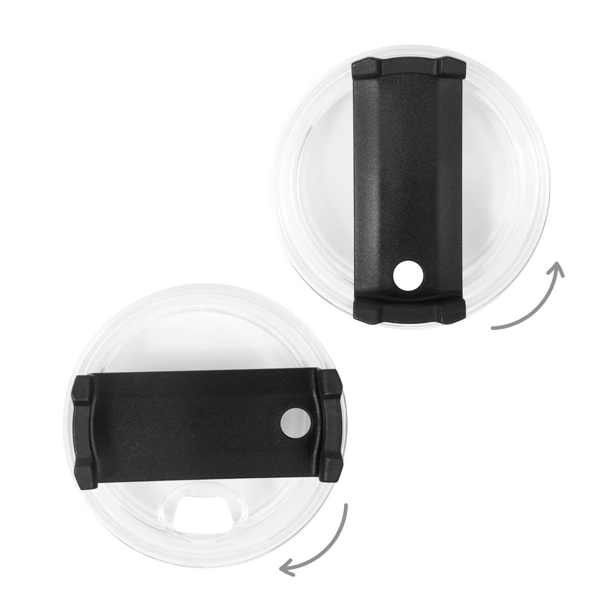De doble pared. Pared interna y externa de plástico. Tapa de plástico con cierre de rosca. Sobre tapa giratoria de plástico con opción para beber con popote o boquilla tradicional. Capacidad de 30 Oz. Base de 7 cm de diámetro. Incluye popote de plástico y caja individual.