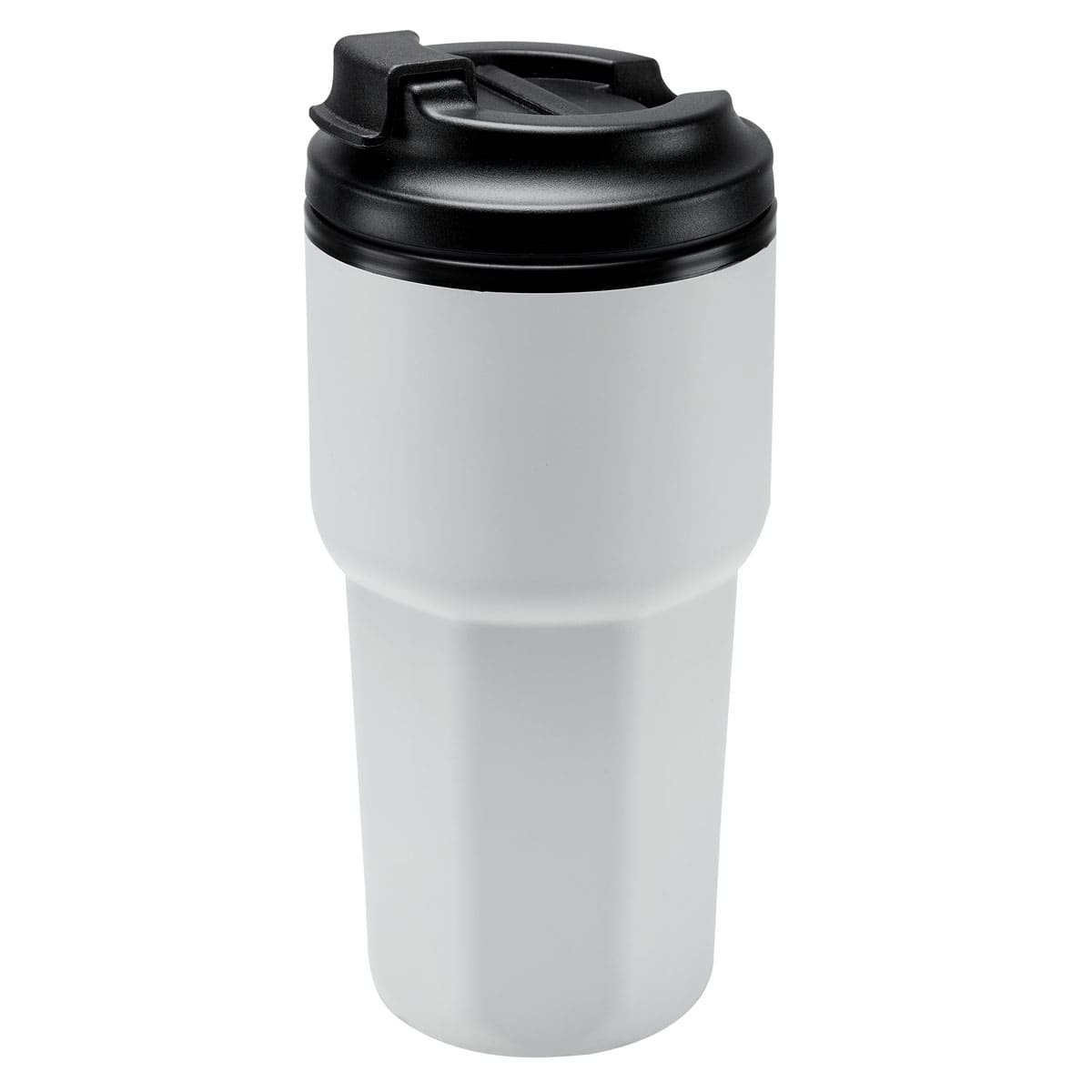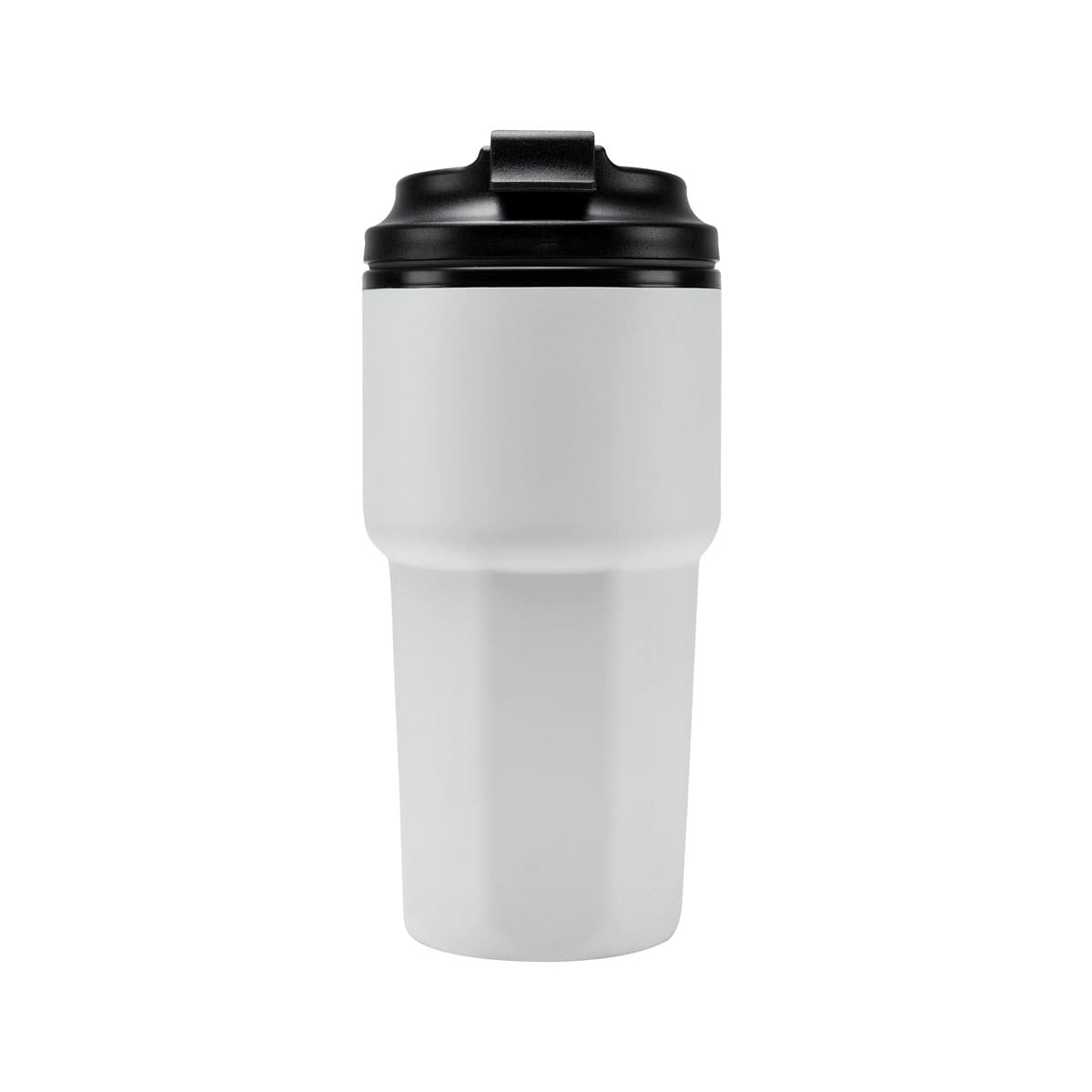 Doble pared. Pared interna plástico, pared externa acero inoxidable. Base de termo con forma hexagonal. Tapa de plástico con boquilla y sobre tapa de cierre a presión. Terminado mate. Incluye caja individual