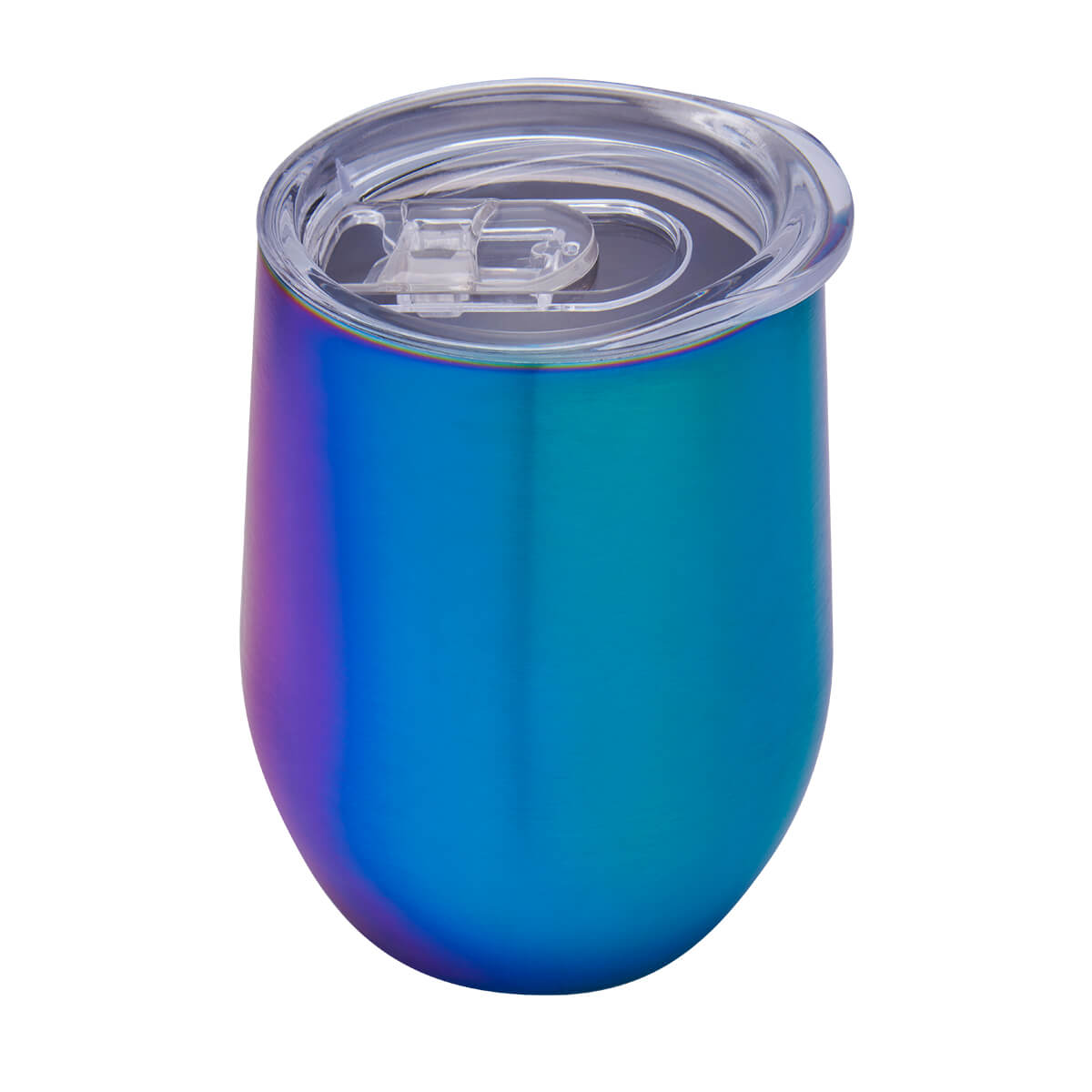 Doble pared. Cerrado al vacío. Pared interna y externa acero inoxidable. Color efecto tornasol. Tapa de plástico con válvula de seguridad. Mantiene temperatura caliente 6 hrs y temperatura fría 8 hrs aproximadamente. Incluye caja individual.