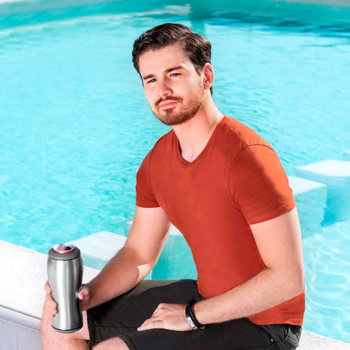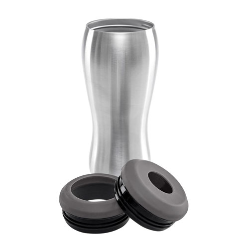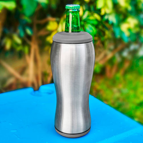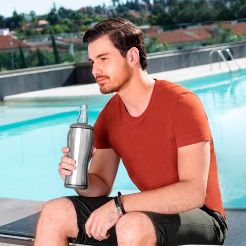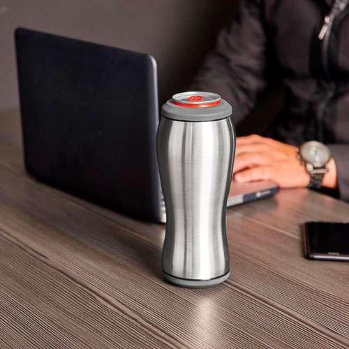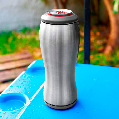 Doble pared. Pared interna y externa acero inoxidable. Tapas intercambiables para lata o botella. Mantiene la bebida fría. Incluye caja individual.