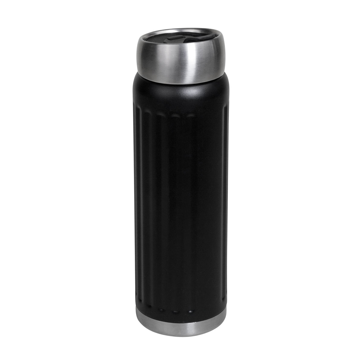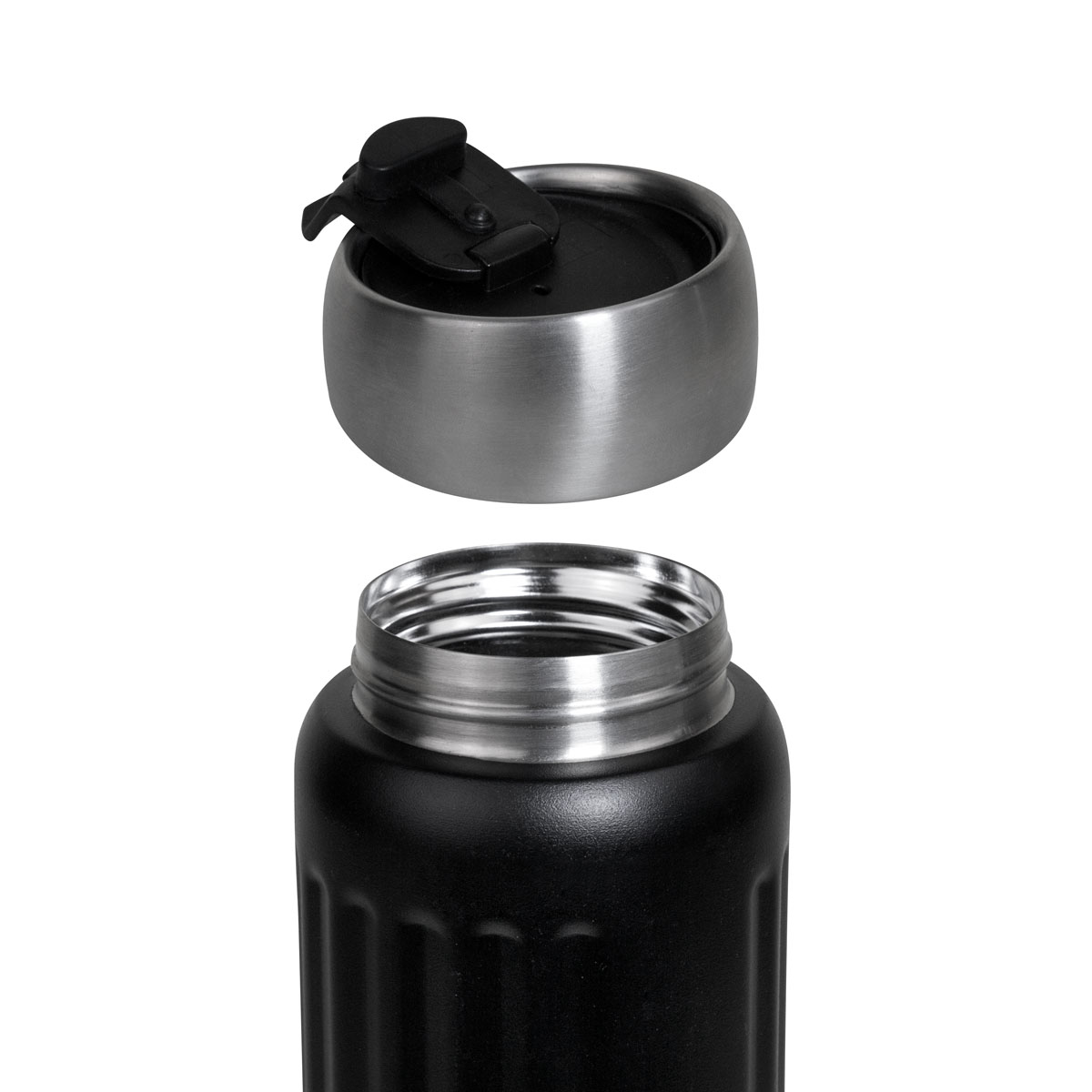 Doble pared. Cerrado al vacío. Pared interna y externa acero inoxidable. Tapa metálica con sistema de rosca. Sobre tapa de plástico con sistema de push. Terminado rugoso. Mantiene temperatura caliente 6 hrs y temperatura fría 12 hrs aproximadamente. Incluye caja individual
