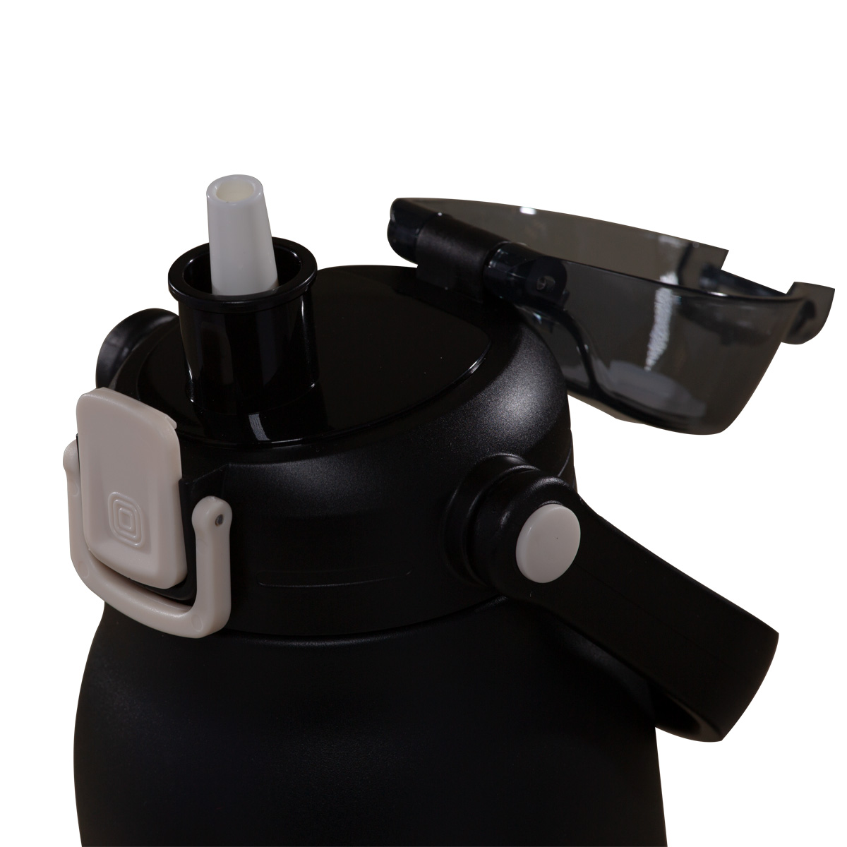 Doble pared. Cerrado al vacío. Pared interna y externa de acero inoxidable. Terminado rugoso. Tapa de plástico con sistema de rosca. Sobretapa con cierre push y seguro antiderrame. Asa plegable incluida. Mantiene temperatura caliente hasta 6 hrs y temperatura fría hasta 12 hrs. Caja individual incluida.