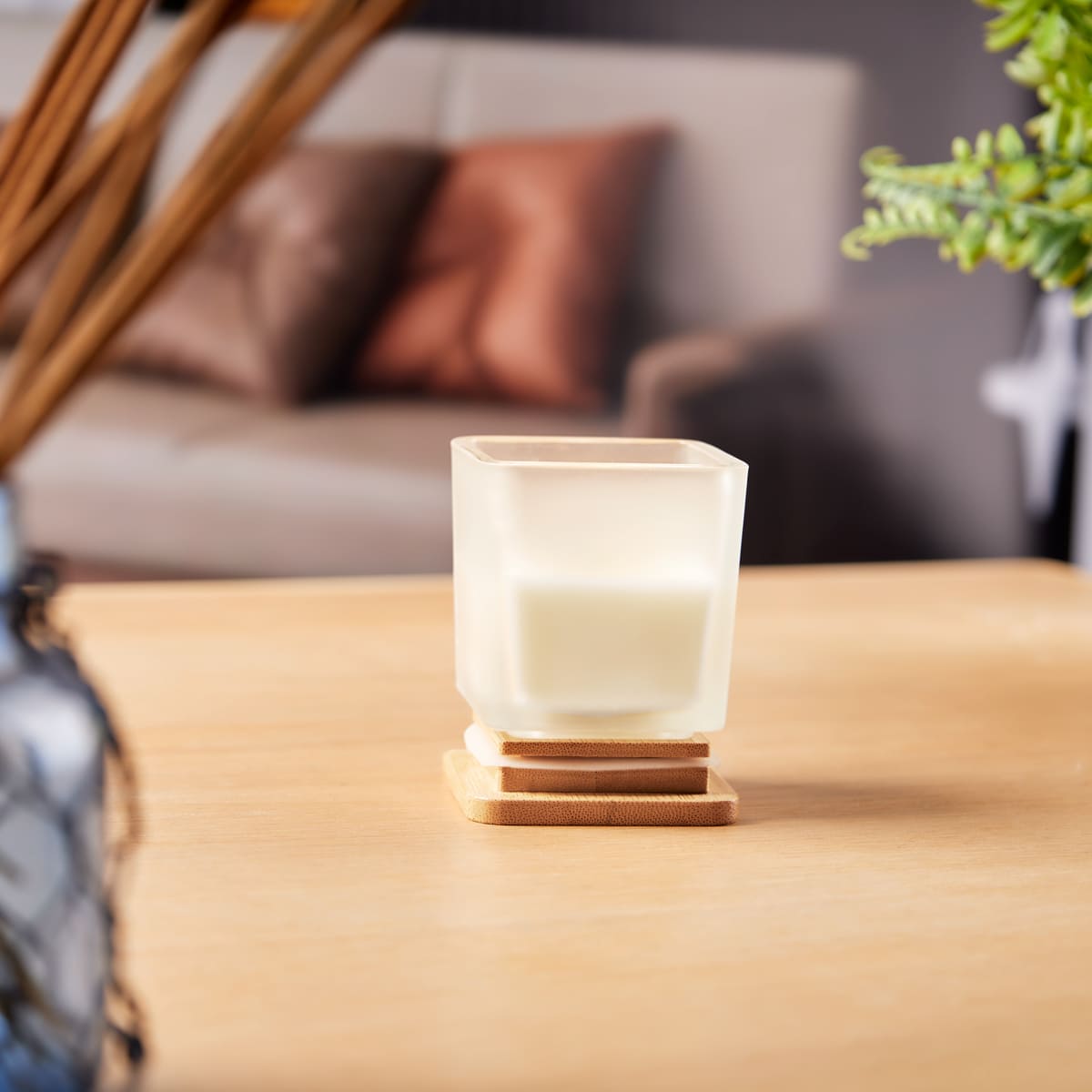 Vela decorativa cuadrada con tapa de bambú y acabado tipo frosty. Aroma a vainilla. El bambú es un producto natural el cual puede presentar variaciones en tonalidades y vetas.