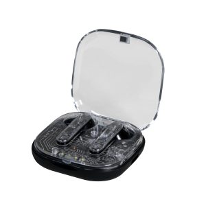 Audífonos bluetooth con base recargable. Su diseño permite una visión a su circuito interno gracias a su estructura transparente. Reproduce tu música favorita por 6 horas aproximadamente con un alcance de conexión de 10 metros. Incluye estuche con conexión tipo C, cable de carga y caja individual.Material: PlásticoCapacidad: Medidas: 5.5 x 5.5 cm